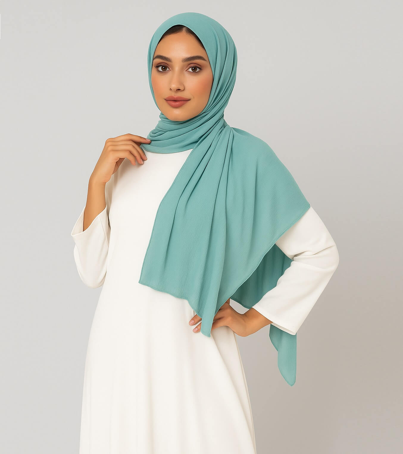 Die mintgrüne Farbe des Wavy Hijab verleiht deinem Look eine erfrischende Leichtigkeit und lässt dich strahlen. Die gewellte Struktur des Hijabs fängt die Aufmerksamkeit ein und verleiht deinem Outfit eine dynamische Note.