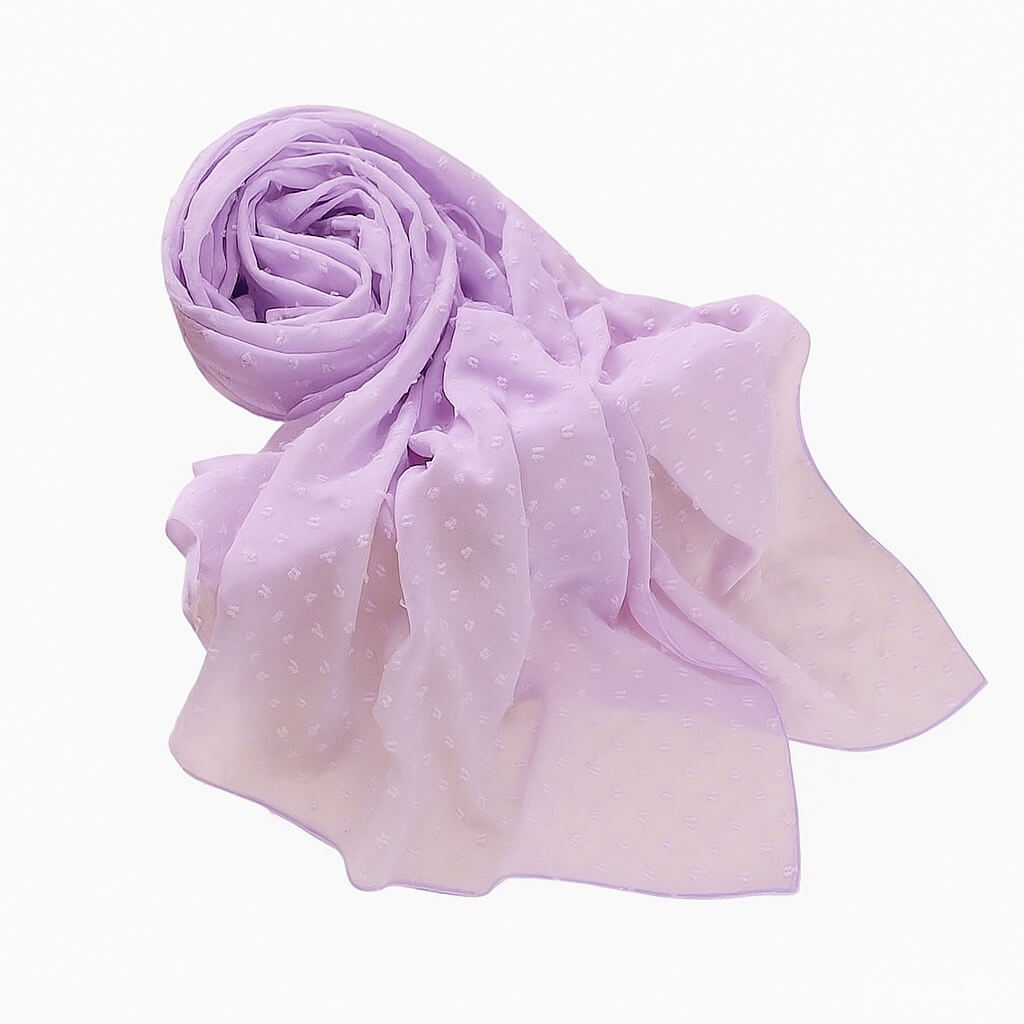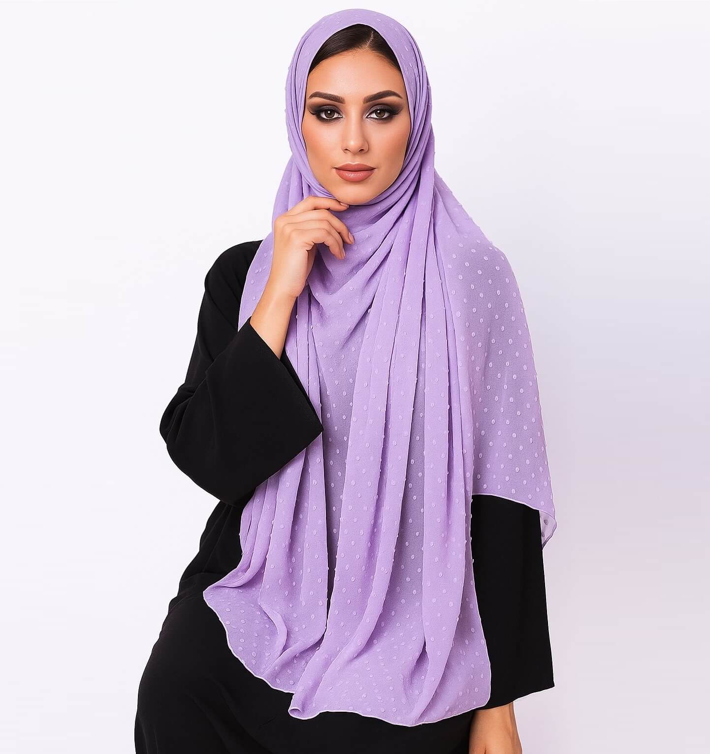 Der hochwertige Chiffonstoff ist leicht, atmungsaktiv und angenehm weich auf der Haut. Die dezente Struktur mit feinen Punkten verleiht dem Tuch eine stilvolle Textur und sorgt für das gewisse Etwas. Dank seiner großzügigen Maße lässt sich der lavendelfarbene Hijab mühelos in verschiedene Looks stylen – klassisch, modern oder kreativ drapiert.
