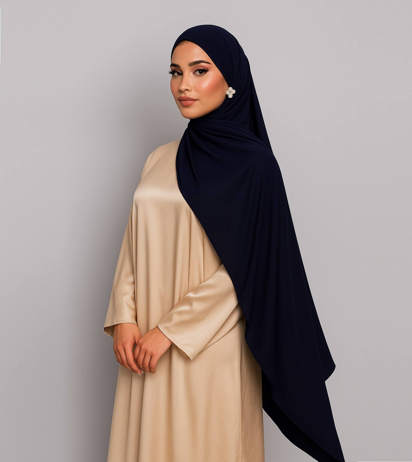 Verleihe deinem Look eine Note von klassischer Raffinesse mit dem Liquid Jersey Hijab in Navy – ein tiefes, sattes Dunkelblau, das Ruhe und Stärke zugleich ausstrahlt. Die elegante Farbe wirkt edel und dezent, lässt sich vielseitig kombinieren und harmoniert perfekt mit hellen, neutralen oder kräftigen Tönen.