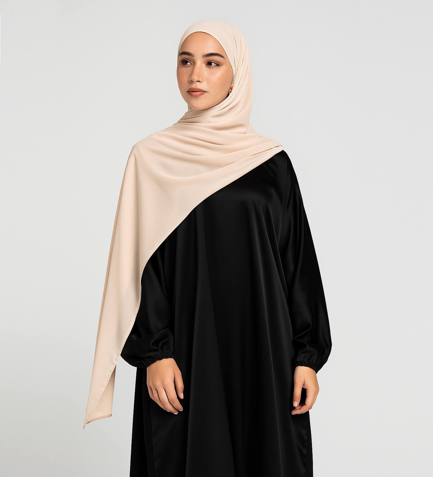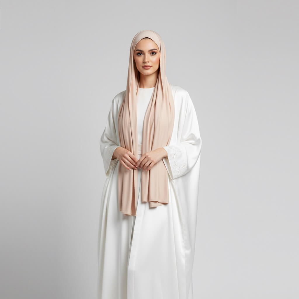 Ob im Alltag, beim Gebet oder zu besonderen Anlässen – das Liquid Jersey Kopftuch in Creme & Sand Beige steht für natürliche Schönheit, Komfort und dezenten Luxus.